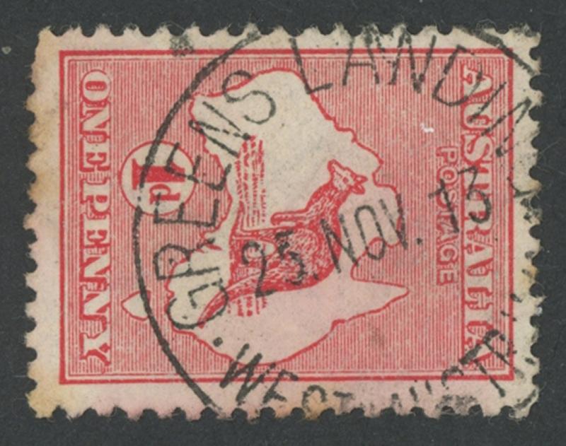 Greens Landing: 'GREENS LANDING/25.NOV.13/WESTN AUSTRALIA' cds very fine large-part strike on Kangaroos 1d red, a couple of shortish perfs. PO 10.2.1913; renamed Carmel -.7.1915 [Orchards; 35km E of Fremantle]. The Tamiami example on 1d Swan sold at our auction of 7.4.2019 for $319 (Sale 234 Lot 1411). (Image1)