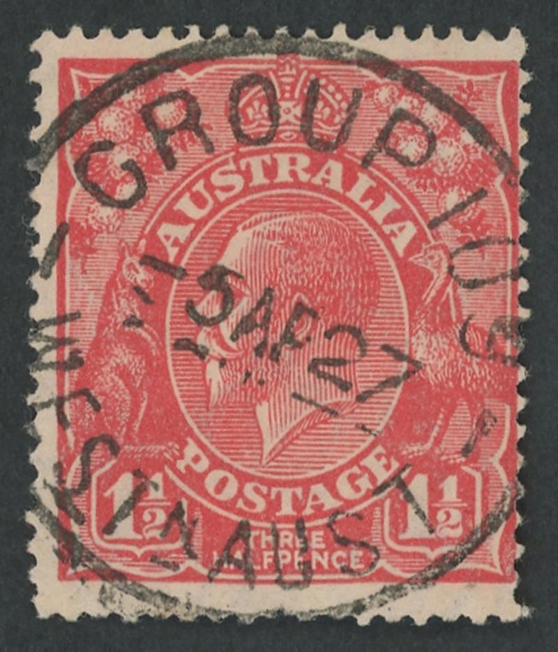 Group Settlement 109: 'GROUP 109/-5AP27/WESTN AUST' cds very fine virtually complete strike on KGV 1½d red while Telegraph Office only. RO 1.6.1924; TO 29.3.1926; PO 1.7.1927; closed 30.12.1927 [2km SE of Northcliffe]. PMI states "No marking known"; apparently the only recorded strike. (Image1)