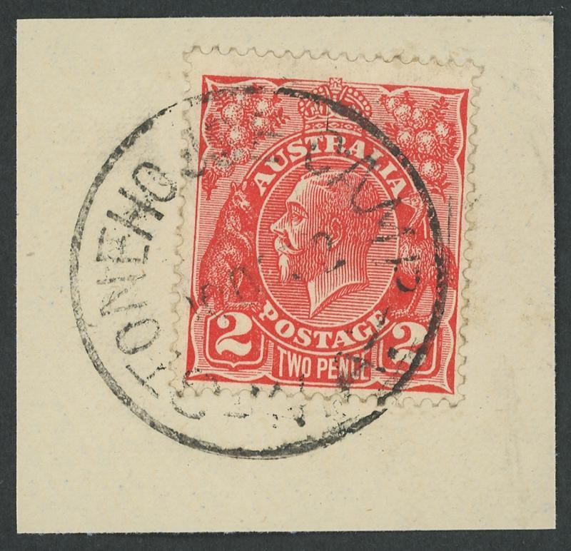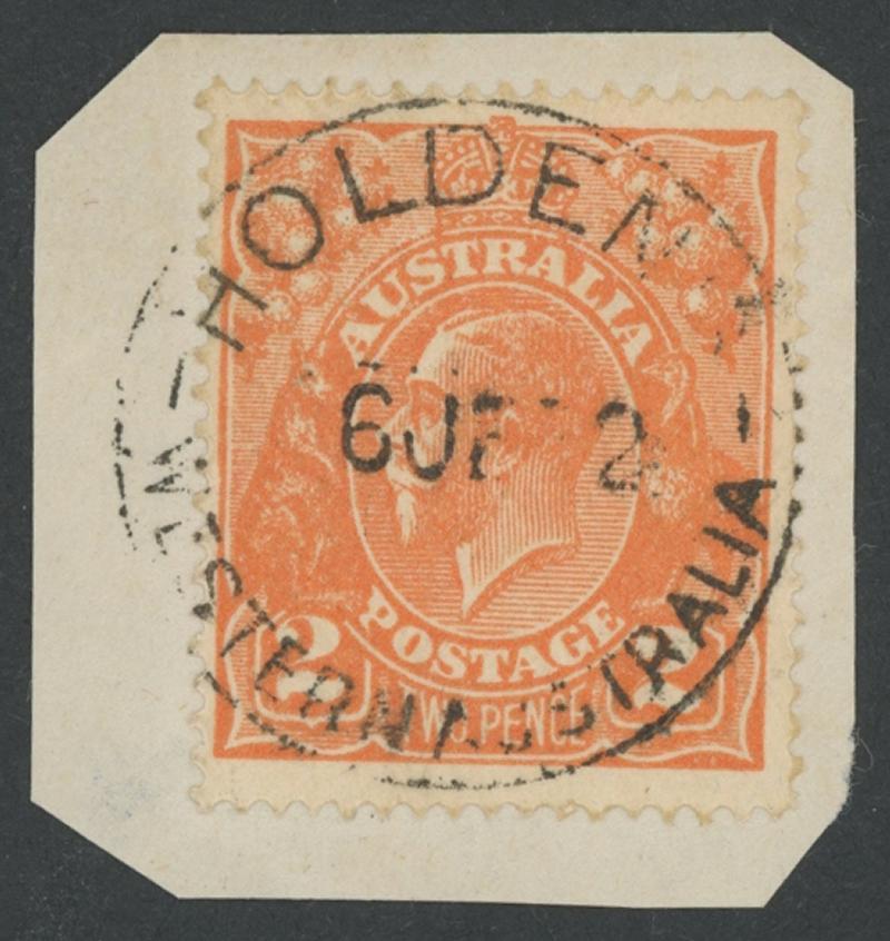Holdens: 'HOLDENS/6JE22/WESTERN AUSTRALIA' cds largely very fine complete strike on KGV 2d orange on-piece while RO only. RO 1.6.1914; closed 31.10.1930 [Mining; 36km SSW of Peak Hill]. PMI records 1919-22 dates only. A similar strike on KGV 1d red on-piece sold at our auction of 26.3.2025 for $480 (Sale 259 Lot 1042). (Image1)