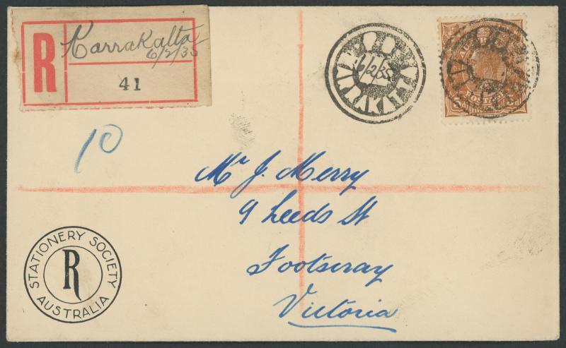 Karrakatta: 'P.O./["6/2/35"]/KARRAKATTA' mail bag seal in relief very fine complete strike alongside KGV 5d brown tied by a second largely very fine strike on Stationery Society philatelic cover registered to Victoria with large blank red/white R label endorsed "Karrakatta/6/2/35", Perth & Melbourne transits and Footscray arrival backstamps, a couple of very minor blemishes. RO 1.1.1922; PO -.-.1925, closed 28.8.1964 [Suburb of Perth]. PMI records one date of '21.3.1935' only. A similar cover without manuscript date sold at our auction of 7.12.2012 for $242 (Sale 177 Lot 878). (Image1)
