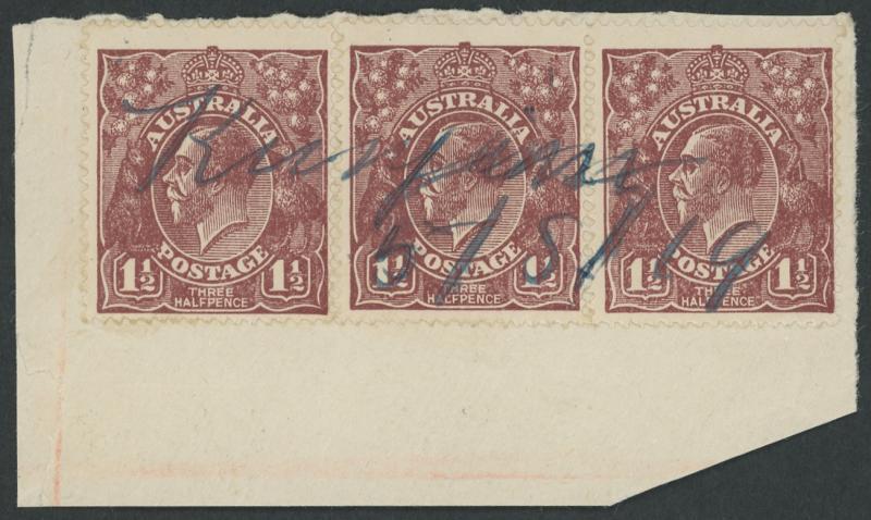 Kunjin: "Kunjin/5/5/19" manuscript in blue ink on KGV 1½d brown strip of 3 on registered piece. Kunjinn RO 2.5.1910; PO 1.1.1912; name changed to Kunjin 1.11.1916; closed 10.12.1945 [Farming; 9km WSW of Corrigin]. The original datestamp inscribed 'KUNJINN' is recorded used until 1929, and then with the final 'N' removed from 1932. The reason for the manuscript cancel at this time is unknown (perhaps the datestamp was mislaid). (Image1)