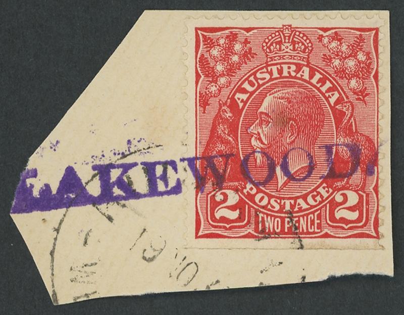 Lakewood: 'LAKEWOOD.' seriffed straight-line provisional cancel very fine virtually complete strike in violet on KGV 2d red on-piece overstruck by light 'KURRAWAN[G]/19NO3[8?]/WE[STN AUST]' cds in the first week of opening. PO 12.11.1938; closed 30.6.1965 [Supply Depot; 10km SE of Kalgoorlie]. Unrecorded by PMI, which does not record use of the first datestamp until July 1939; this canceller was presumably used until that datestamp was received. (Image1)
