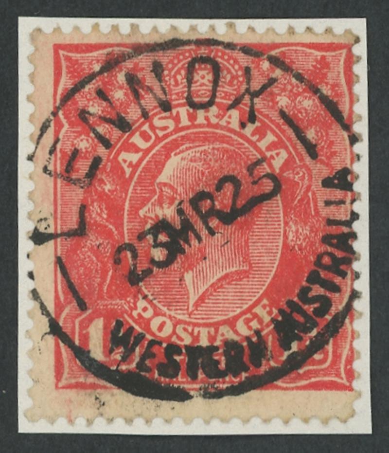 Lennox: 'LENNOX/23MR25/WESTERN AUSTRALIA' cds very fine to superb virtually complete strike on KGV 1½d red while Receiving Office only. RO 1.11.1923; PO 1.7.1927; TO 11.9.1929 [Group Settlement 52; 14km SW of Busselton]. Superior to a light complete strike also on KGV 1½d red that sold at a Perth auction in 2021 for $265. (Image1)