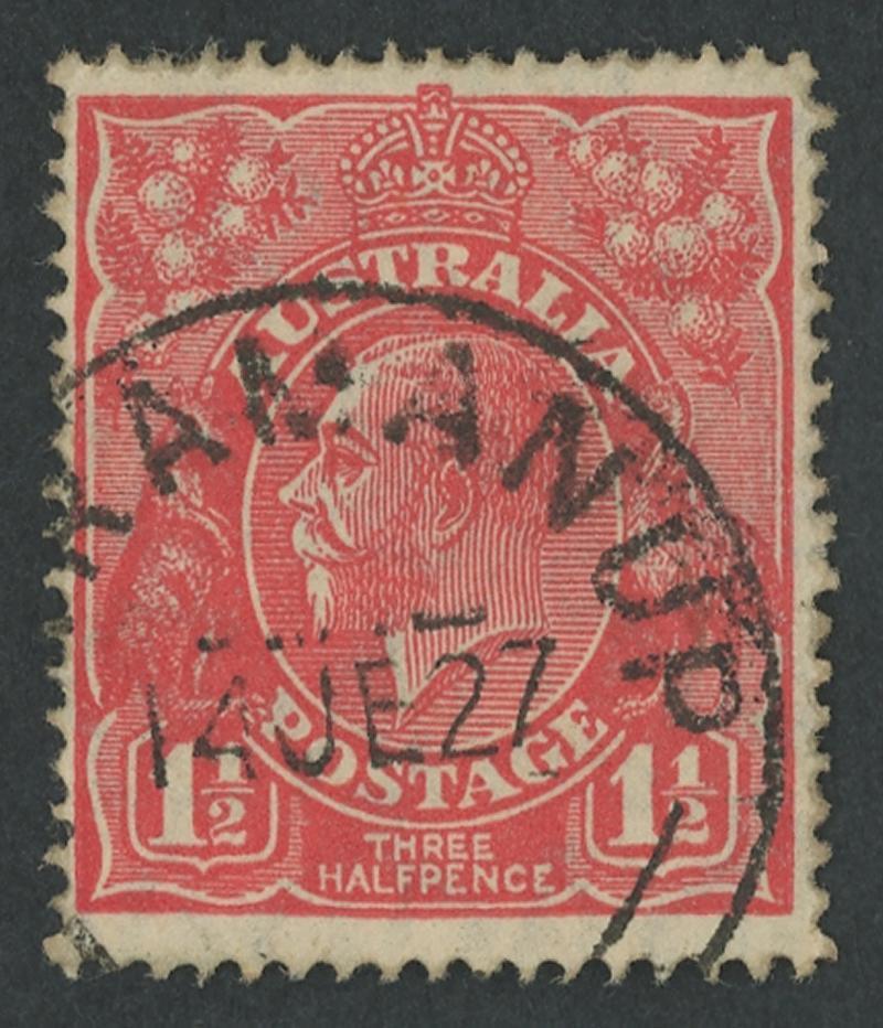 Marmanup: '[MA]RMANUP/14JE27/[W.A]' cds very fine partial strike on KGV 1½d red while Receiving Office only. RO 1.8.1924; PO 1.7.1927; closed 24.9.1930 [Group Settlements 82 & 125; 15km WNW of Serpentine]. PMI states "No marking known"; apparently the second recorded strike: a similarly-incomplete example also on KGV 1½d red sold at a Perth auction in 2021 for $368. (Image1)