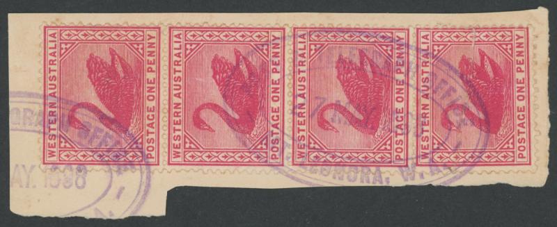 Mount Leonora: 'POST & TELEGRAPH OFFICE/27.MAY.1898/MT. LEONORA. W.A.' triple-ring oval datestamp largely very fine virtually complete strike in violet on Swans 1d red x4 on-piece with a small part-strike alongside. PO 22.10.1897; officially renamed Leonora 10.7.1908 [Gold Mining; 202km N of Kalgoorlie]. PMI Type ORS2 recorded 1897-1899 only. A similar strike on-piece sold at our auction of 26.3.2025 for $552 (Sale 259 Lot 1058). (Image1)