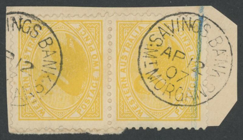 Mount Morgans: 'SAVINGS BANK/AP 12/07/MT MORGANS' cds largely very fine complete strike with another small-part strike alongside on Swans 2d yellow vertical pair on-piece. PO 10.8.1899; renamed Morgans -.-.1909 [Gold Mining; 37km WSW of Laverton]. PMI records dates from Oct 1906 to July 1907 only; two complete overlapping strikes sold at our auction of 25.3.2025 for $180 (Sale 259 Lot 1059). (Image1)