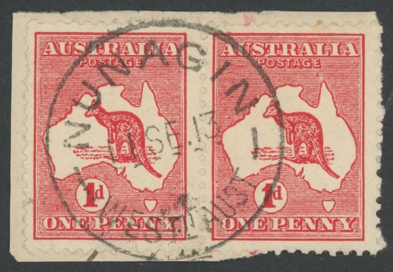 Nunagin: 'NUNAGIN/11SE13/WESTN AUST' cds very fine complete strike on Kangaroos 1d red pair on small piece. RO 1.10.1911; PO 16.1.1913; renamed Bruce Rock -11.1913 [46km SSW of Merredin]. PMI records usage from Aug-Nov 1913 only. (Image1)