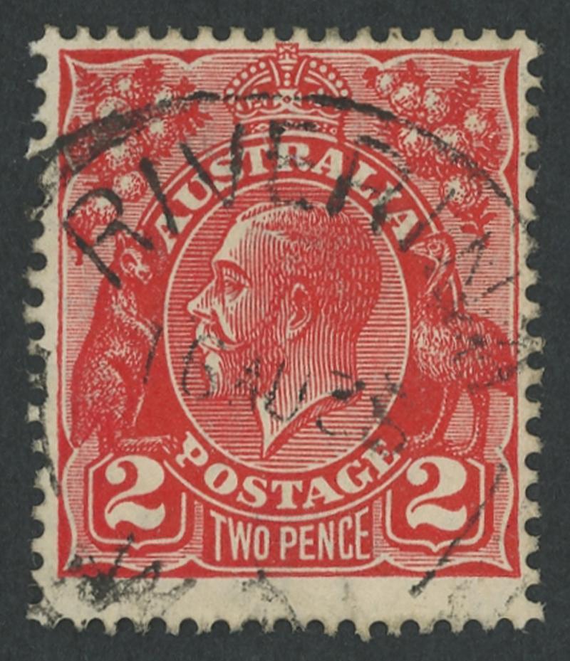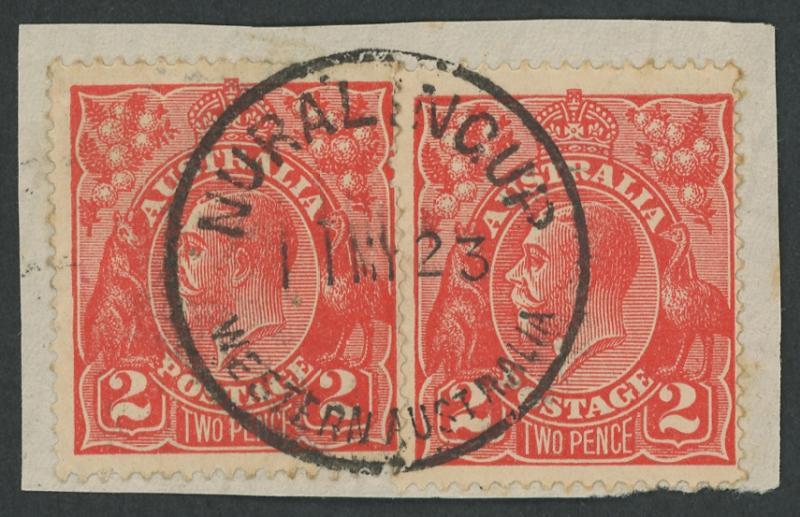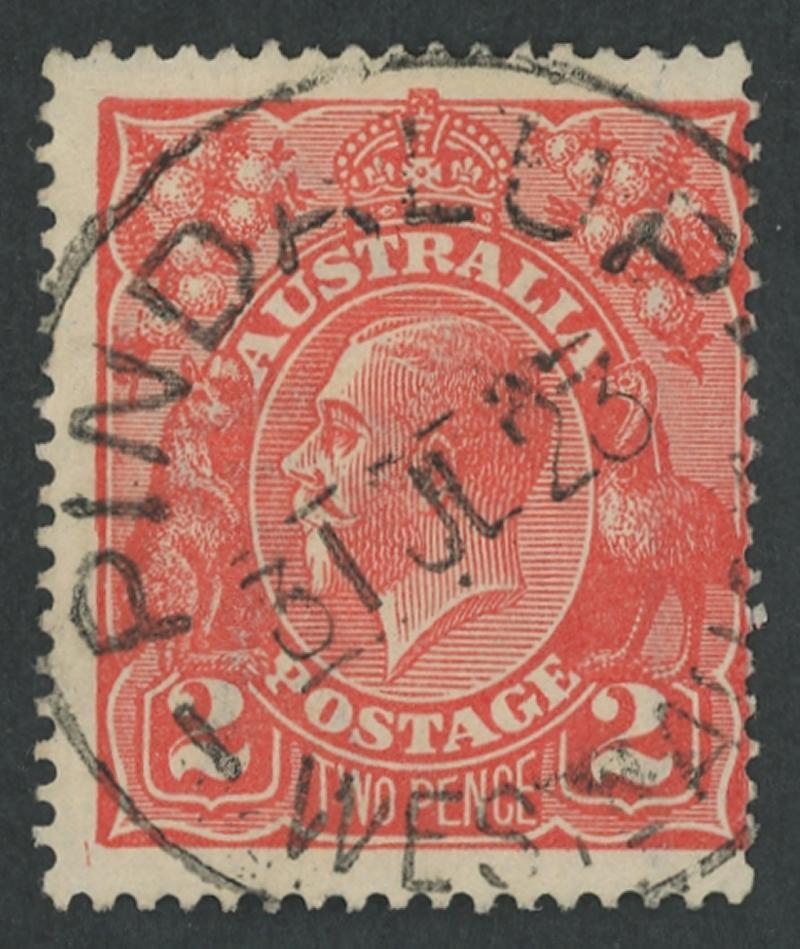 Pindalup: 'PINDALUP/31JL23/WESTN AU[ST]' cds largely very fine large-part strike on KGV 2d red. RO 2.10.1912; PO 15.9.1913; TO 9.10.1937; closed 11.12.1939 [Timber; 35km E of Pinjarra]. A similar strike sold at a Perth auction in 2023 for $127. (Image1)