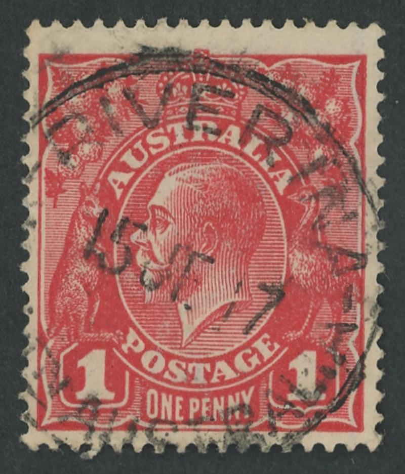 Riverina (1): 'RIVERINA/15JE17/[WES]TN AUSTRALIA' cds largely very fine large-part strike on KGV 1d red. RO 1.4.1915; PO 1.8.1916; RO 1.8.1919; closed 1.4.1925 [Gold Mining; 45km W of Menzies]. A similar strike sold at our auction of 1.10.2021 for $189 (Online Sale 6 Lot 784). (Image1)