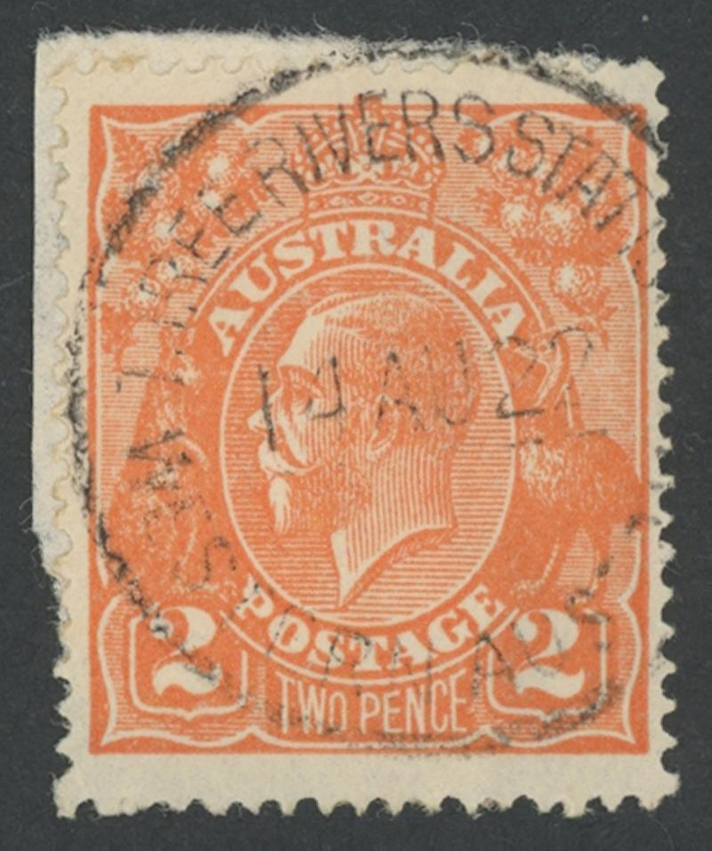Three Rivers Station: 'THREE RIVERS STATION/14AU22/WESTERN AUSTRALIA' cds largely very fine almost complete strike on KGV 2d orange while Receiving Office only. RO 26.10.1920; PO -.-.1927; TO 1.11.1930; closed -.-.1940 [Pastoral Station; 175km NNE of Meekatharra]. PMI records dates from 1930-1938 only; only the second recorded usage in the RO period. An earlier 1921 piece with two complete strikes sold at our auction of 26.3.2025 for $408. (Image1)