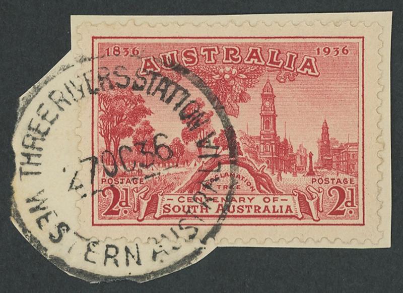 Three Rivers Station: 'THREE RIVERS STATION/27OC36/WESTERN AUSTRALIA' cds largely very fine complete strike on 2d SA Centenary on cut-to-shape piece while Telegraph Office only. RO 26.10.1920; PO -.-.1927; TO 1.11.1930; closed -.-.1940 [Pastoral Station; 175km NNE of Meekatharra]. (Image1)