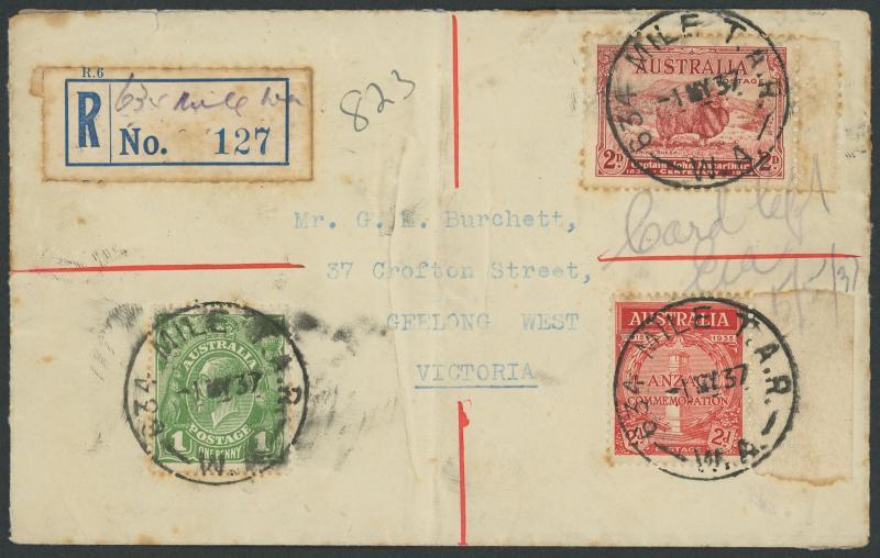 Trans-Australian Railway: '634 MILE T.A.R/-1MY37/W.A' cds three fine to very fine complete strikes on KGV 1d green, 2d Macarthur & 2d ANZAC on philatelic cover registered to Victoria with plain provisional R label endorsed "634 Mile WA" plus another very fine strike on the reverse, some toning. PO 1.4.1935; TO 2.6.1937; closed ? [Railway Construction Camp; 675km E of Kalgoorlie]. Only the second registered cover recorded by us (and the only one with an endorsed R label); the other sold at our auction of 25.3.2021 for $649 (Sale 243 Lot 710). (Image1)