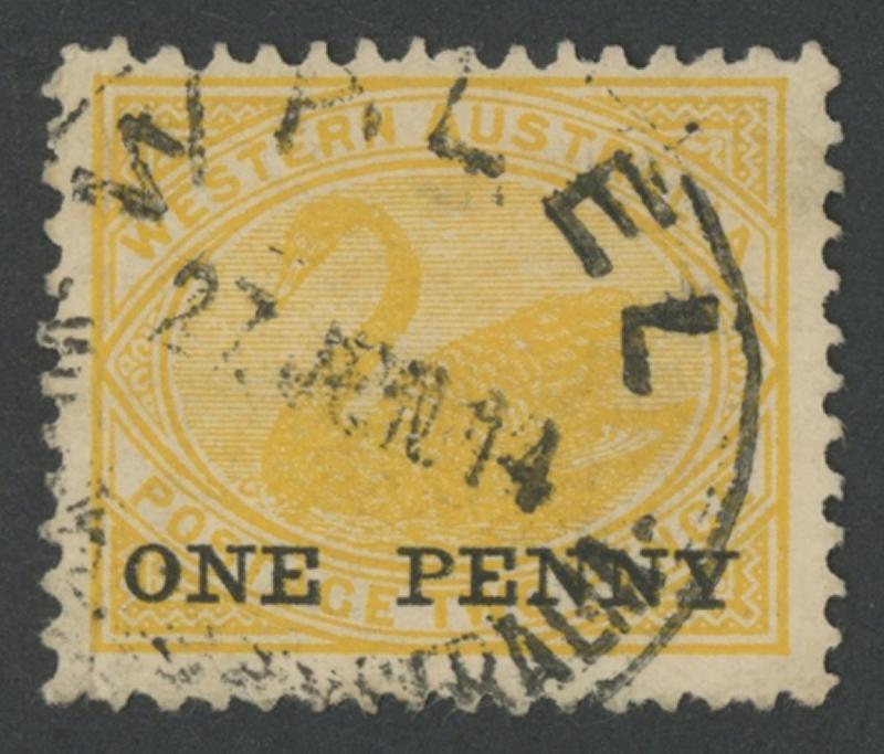 Waeel: 'WAEEL/27JUN14/WESTERN AUSTRALIA' cds largely fine large-part strike on Swans 'ONE PENNY' surcharge on 2d yellow. PO 15.9.1904; RO 1.10.1906; PO 12.5.1913; closed 5.9.1917 [13km E of Meckering]. PMI records usage from 29.4.1914 to 18.6.1915 only, making this possibly the first known strike on Swans. (Image1)