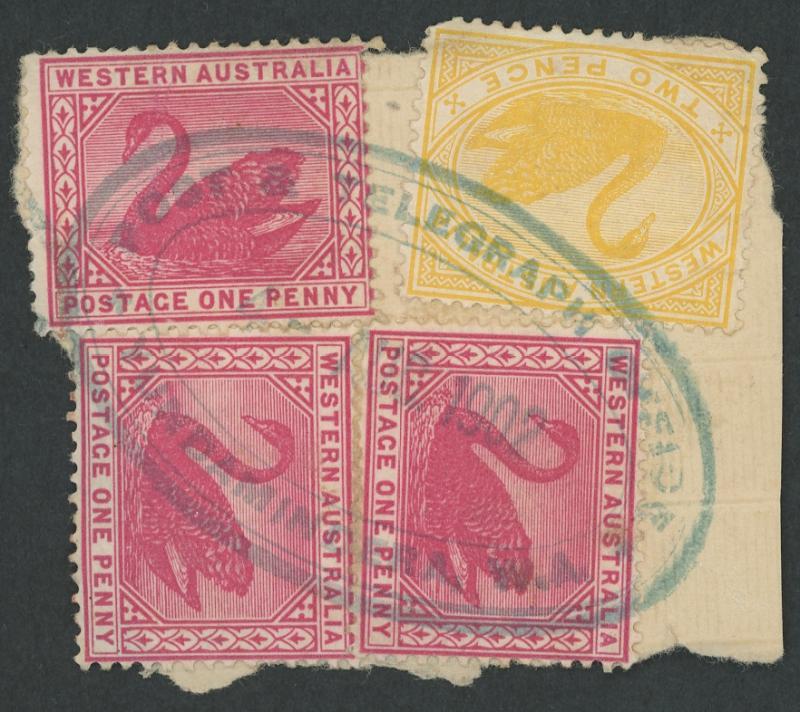 Yundamindera: ‘POST & TELEGRAPH OFFICE/4-AUG1902/YUNDAMINDERA, W.A' triple-oval datestamp (LRD) largely very fine complete strike in blue on Swans 1d red x3 & 2d yellow on-piece. Renamed from The Granites PO early 1901; RO 1.10.1913; TO 28.12.1914 [Gold Mining; 70km NE of Menzies]. PMI records dates from June-July 1902 only. A partial strike sold at a Perth auction in 2021 for $173. (Image1)