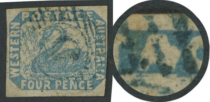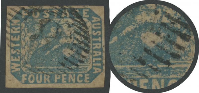 1854-55 Lithographs Imperforate Swan 4d blue SG 3 with unlisted variety Thick Right Limb of 'A' of 'POSTAGE', margins just clear - at lower-left - to good, light 15-bar '5' cancel, Cat £250. Gibbons do list Thin Right Limb of 'A' as SG 3w (Cat £2000), which may be a retouch of this flaw. (Image1)