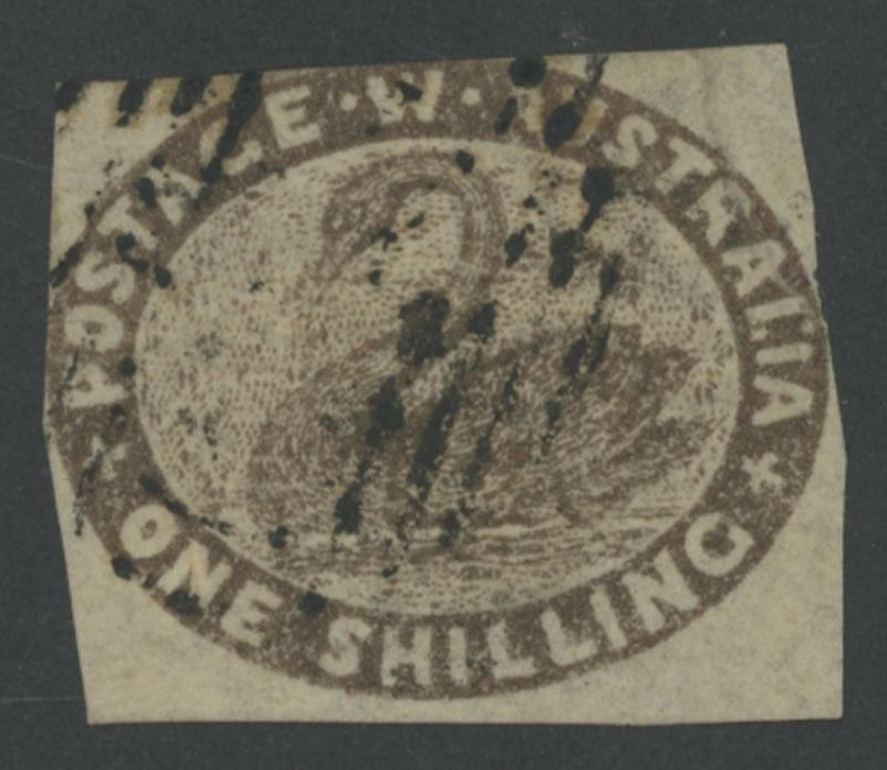1854-55 Swans Lithographs Imperforate 1/- chocolate-brown SG 4a unlisted shade variant, margins good to just touched at top, slightly untidy void-grid cancellation, Cat £1100+ for the normal "deep red-brown" shade. RPSV Certificate (2006) states "uncatalogued chocolate shade ... SG 4a var". (Image1)