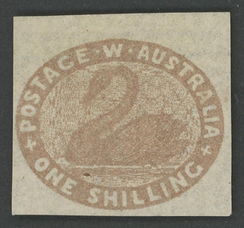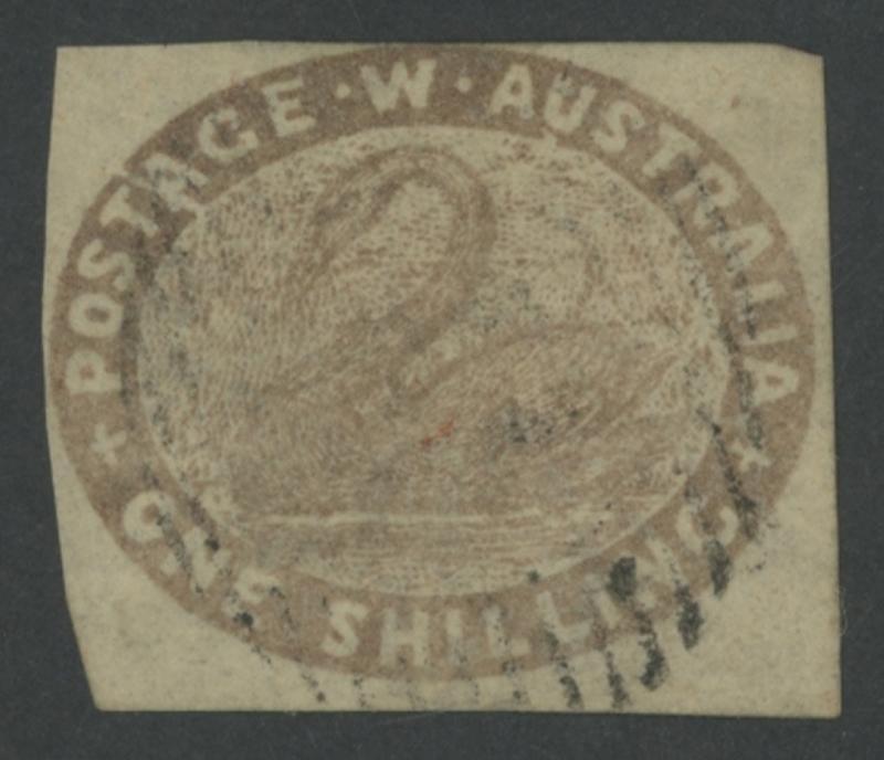 1854-55 Swans Lithographs Imperforate 1/- grey-brown SG 4b with White Line through 'A' of 'POSTAGE', margins close to large at base, light but indistinct numeral cancel, Cat £400+ for normal. RPSV Certificate (2006) states "position R3/5 of the Intermediate Stone". (Image1)