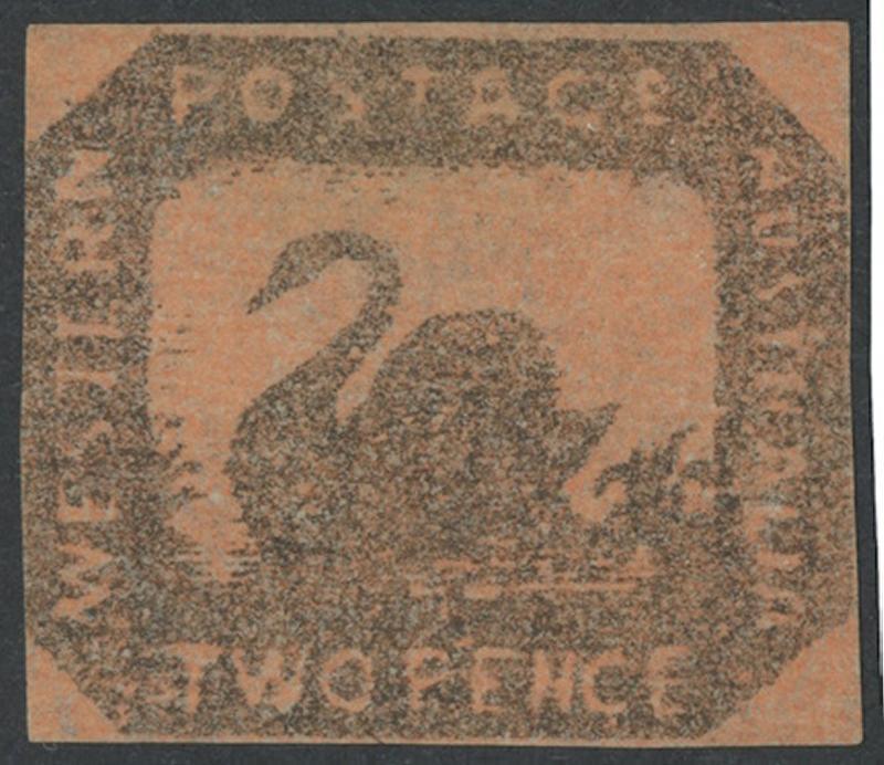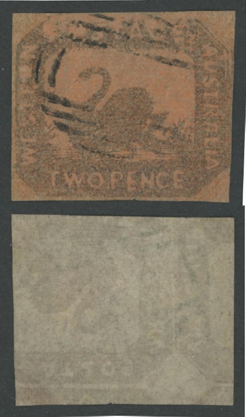 1855-57 Swans Hillman Lithographs Imperforate 2d brown-black/Indian red Printed on Both Sides SG 16a the impression on the 'reverse' inverted relative to the face misplaced slightly to right with a portions of an adjoining unit, additionally with Transfer Flaw Narrowed Right Frame & Flaw on 'R' of 'AUSTRALIA', margins close to large at right, light but largely very fine 15-bar Numeral '13' of Pinjarrah, Cat £950+ for normal. RPSV Certificate (2007). (Image1)