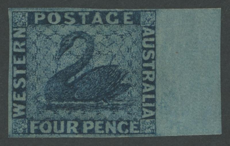 1860-64 Swans Printed in the Colony from Perkins Bacon Plates Imperforate 4d deep blue SG 27 marginal example from the right-hand side of the sheet, margins close to large, unused, Cat £400. An impressive single. (Image1)