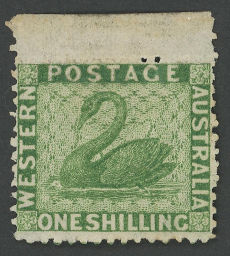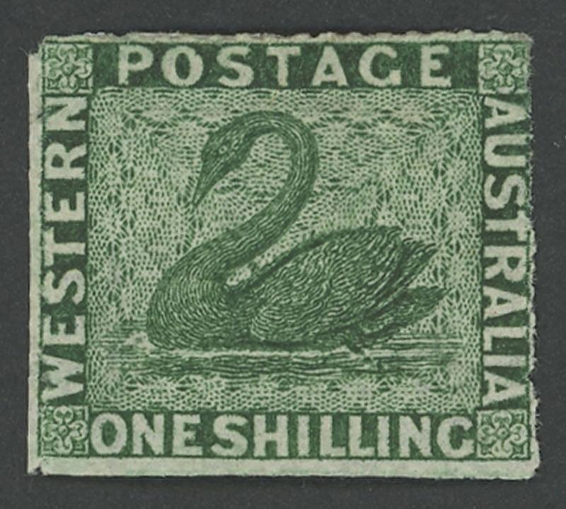 1861 Swans Printed by Perkins Bacon in London Very Rough Perf 14-16 1/- deep green SG 46, cut from the sheet at left to preserve the design, gorgeous rich colour, large-part gum, Cat £6000. Ex Alfred Caspary - Sale 15 (6-9.10.1958) Lot 591, realised £35. Also Ex 'Freemantle' - sold at our auction of 11.7.2008 for $5360 (Sale 137 Lot 609) - and 'Dubois' (III): sold for SFr3170. By way of comparison, Caspary's unused 1857 6d golden-bronze SG 17 which currently is catalogued at £22,000 - or almost four times the SG 46 price - sold for £60. (Image1)