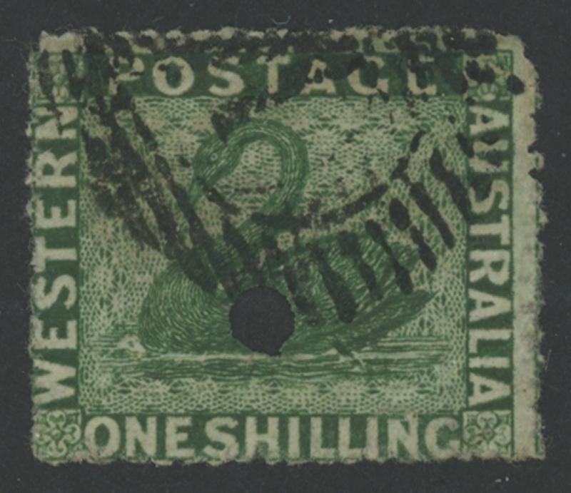 1861 Swans Printed by Perkins Bacon in London Very Rough Perf 14-16 1/- deep green SG 46 with 3mm imperial puncture, indistinct numeral cancel, Cat £600+ for a normal stamp plus a significant premium for the puncture. Chris Ceremuga Certificate (2010). (Image1)
