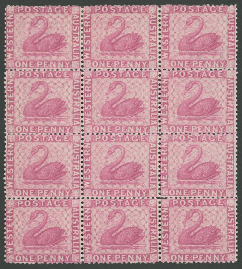 1888 Swans New Colours 1d bright carmine-pink SG 103 block of 12 (3x4), remarkably well-centred, hinge-remainder on one unit otherwise virtually full gum with seven units being unmounted, Cat £420+ for mounted singles. A gorgeous block. Ex Cecil Walkley - sold at our auction of 14.4.2005 for $291 (Sale 115 Lot 350) - Jan Hansen (Denmark) - sold at our auction of 6.8.2011 for $560 (Sale 167 Lot 519) - and 'Dubois' (III): sold for SFr373. (Image1)