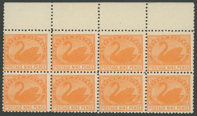 1902-11 Printed in Melbourne V/Crown Watermark Perf 11 Swan 9d red-orange ACSC W51B (SG 133) marginal block of 8 (4x2) from the top of the sheet, two units lightly mounted otherwise full unmounted gum, Cat $2400+ (£1600+) for mounted singles. Note that both the ACSC and Gibbons incorrectly state that the shade is "yellow-orange". A rare multiple. (Image1)