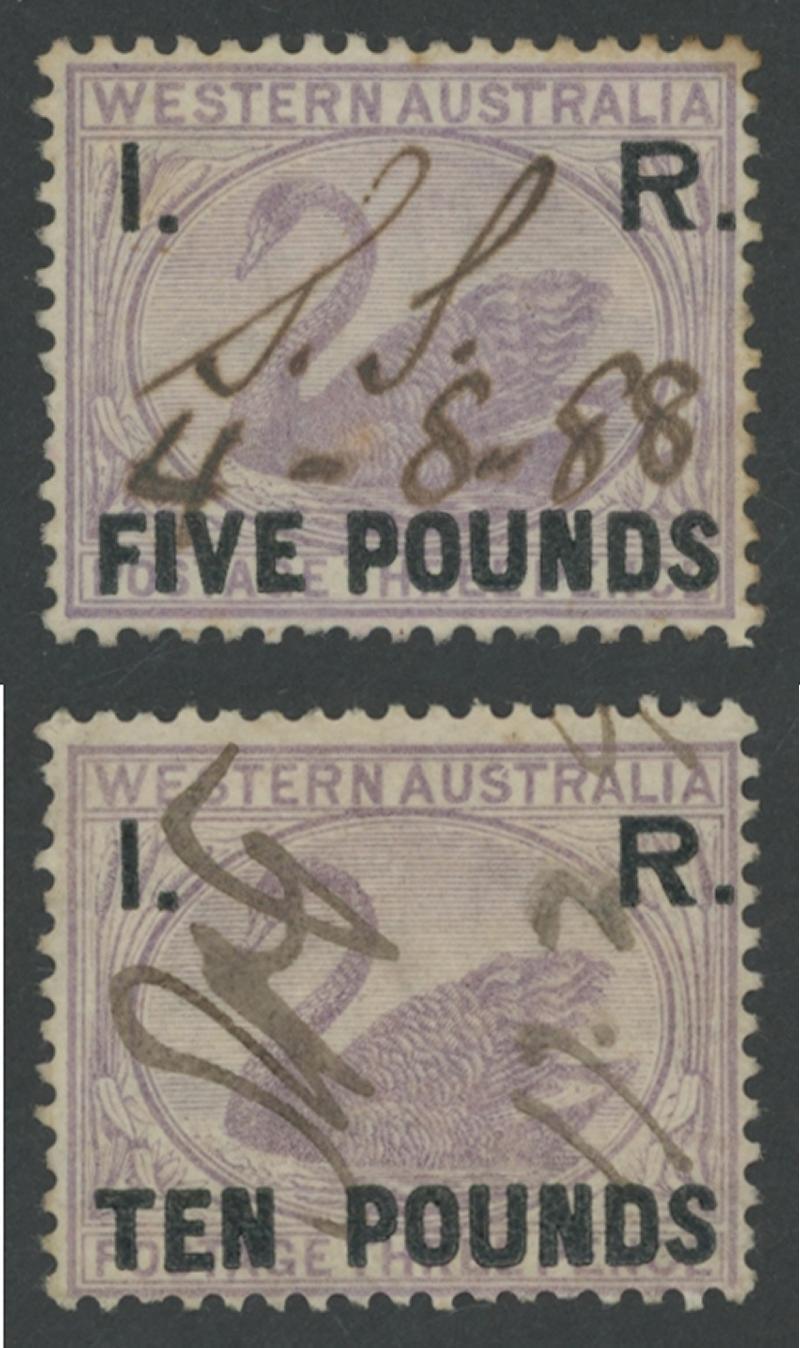 REVENUES: 1881 'I. R.' Surcharges on Swan 3d lilac 'ONE PENNY' to 'TEN POUNDS' complete set Dzelme R3-R16 with mostly light manuscript cancellations (the 2d postally used), selected fine to very fine condition, Elsmore Online Cat $600+. Most values were issued in very small numbers; of the 7/6d & 15/- only 1200 each were printed; of the £5 & £10 only 960 each were printed. (Image1)