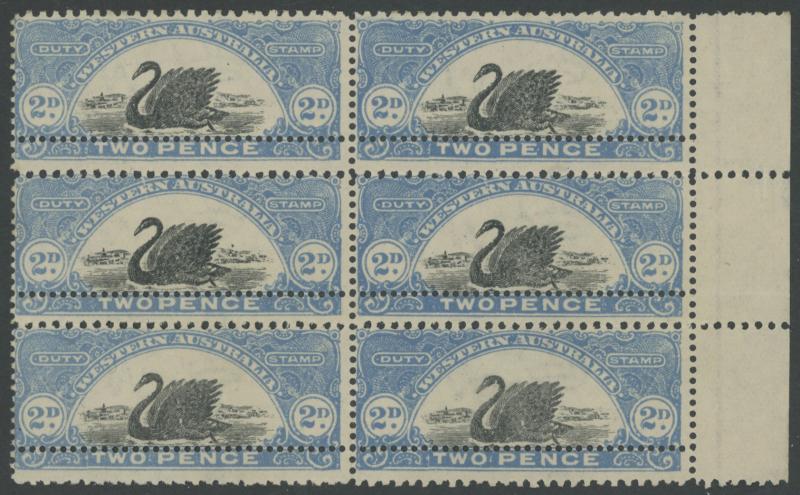 REVENUES: 1922-30 Duty Stamp Swan Bicolours Lithographed W[Crown]A Type 7 Wmk Perf 14½x13½ 2d black & light blue marginal block of 6 (3x2) from the right-hand side of the sheet, the horizontal perforations cutting the design and reperforated Line Perf 11 horizontally resulting in Double Perforations Horizontally and Mixed Perforations 13½x14½x11x13½ Dzelme R129Aa, lightly mounted in the margin only, the stamps very fine unmounted, unpriced/unrated. (Image1)
