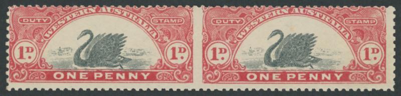 REVENUES: 1909 Duty Stamp Swan Bicolours Lithographed W[Crown]A Type 6 Wmk Perf 11 1d greenish-slate & scarlet horizontal pair Imperforate Vertically Dzelme R85Bc, small hinge remainder across both units, rated RRR. (Image1)