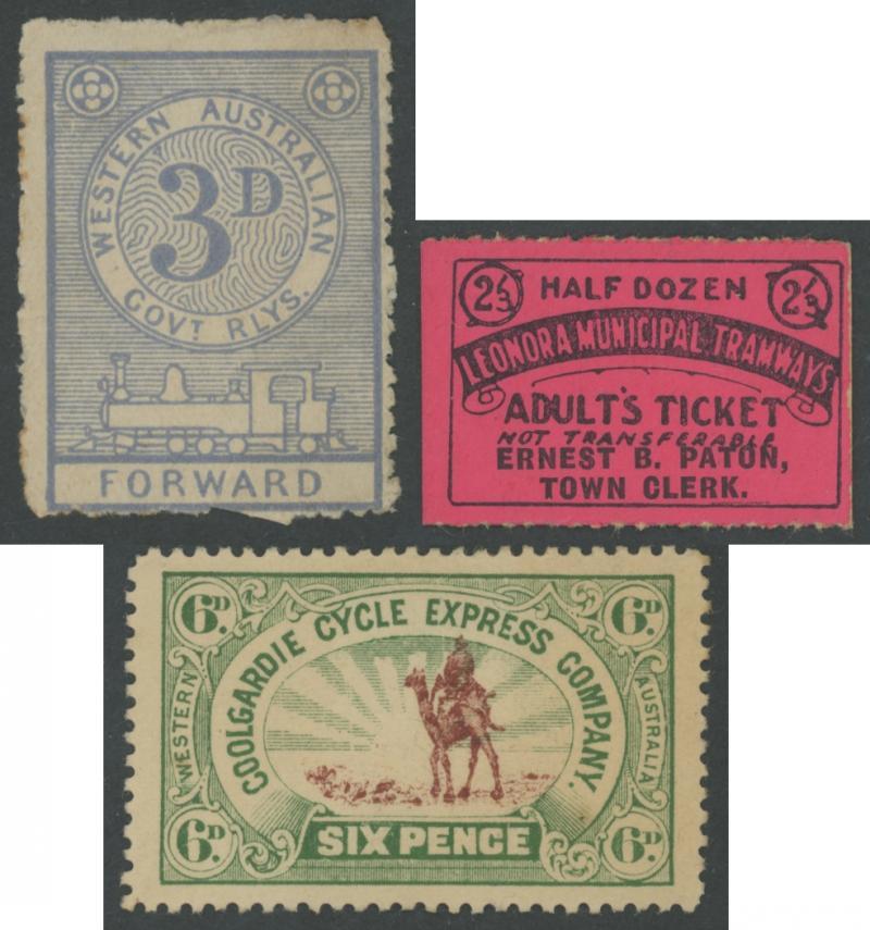 RAILWAY STAMPS: Dealer's remainders with Large Type to 1/6d shades x6, a few Small Types including unused 3d, Safety & Service values including 60c mint block of 4 & used pair, some duplication, also tram & bus tickets including Leonora Municipal Tramways x9, and a very fine mint Coolgardie Cycle Express 6d camel with large-part sandy gum.