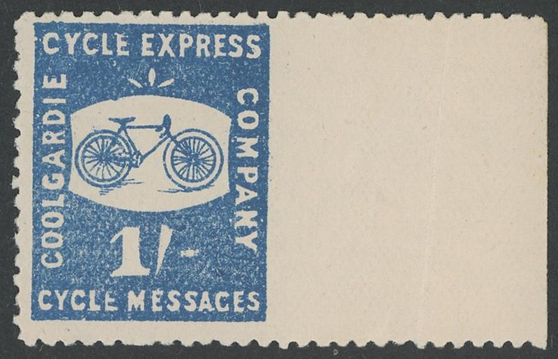 LOCAL POST: 1895 Coolgardie Cycle Express 1/- blue marginal example from the right of the sheet Imperforate at Right, very fresh with large-part original gum. RPSL Certificate (1974). Ex 'Freemantle' - sold at our auction of 11.7.2008 for $745 - and 'Dubois' (I): sold for SFr390. (Image1)