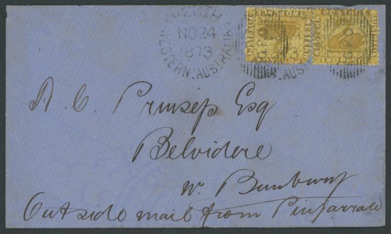 1873 (Nov 24) envelope to Belvidere endorsed "(Outside mail from Pinjarrah)" with Swans 2d bistre x2 tied by very fine Perth duplex cancel, largely very fine 'PINJARRAH/NO24/1873/WESTERN AUSTRALIA' unframed cds transit backstamp, a few minor transmission marks & closed tears on back flap. The rate was double 2d per ½oz intra-Colonial letter. Belvidere (Beach) lies some 75km S of Pinjarrah and never had a Post Office; the closest major towns to Belvidere are Australind & Bunbury, yet the endorsement unusually requests carriage outside the regular mails from Pinjarrah. (Image1)