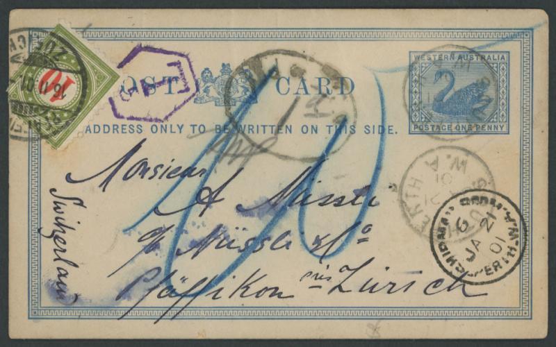 1901 (Jan 21) usage of Postal Card Swans 1d blue with 'SOUTH PERTH/WA' cds cancel, to Switzerland with message in German "... hoffe bald eine Dtelle unter Government zu haben. In Süd Aust ist nichts ..." [hope to soon have a Government position. Nothing doing in South Australia] but without added franking and taxed locally with very worn 'MORE TO PAY' oval handstamp endorsed "1d" and again at Perth with 'T/5' [centimes] hexagonal cachet in violet and 'SHIP MAIL ROOM' transit on the face, rated "10" due on arrival with Switzerland Postage Due 10c green & red (corner fault where affixed over edge) tied by 'PFAFIK[ON]/16.II.01/ZURICH' cds cancel, some bends & blemishes. (Image1)