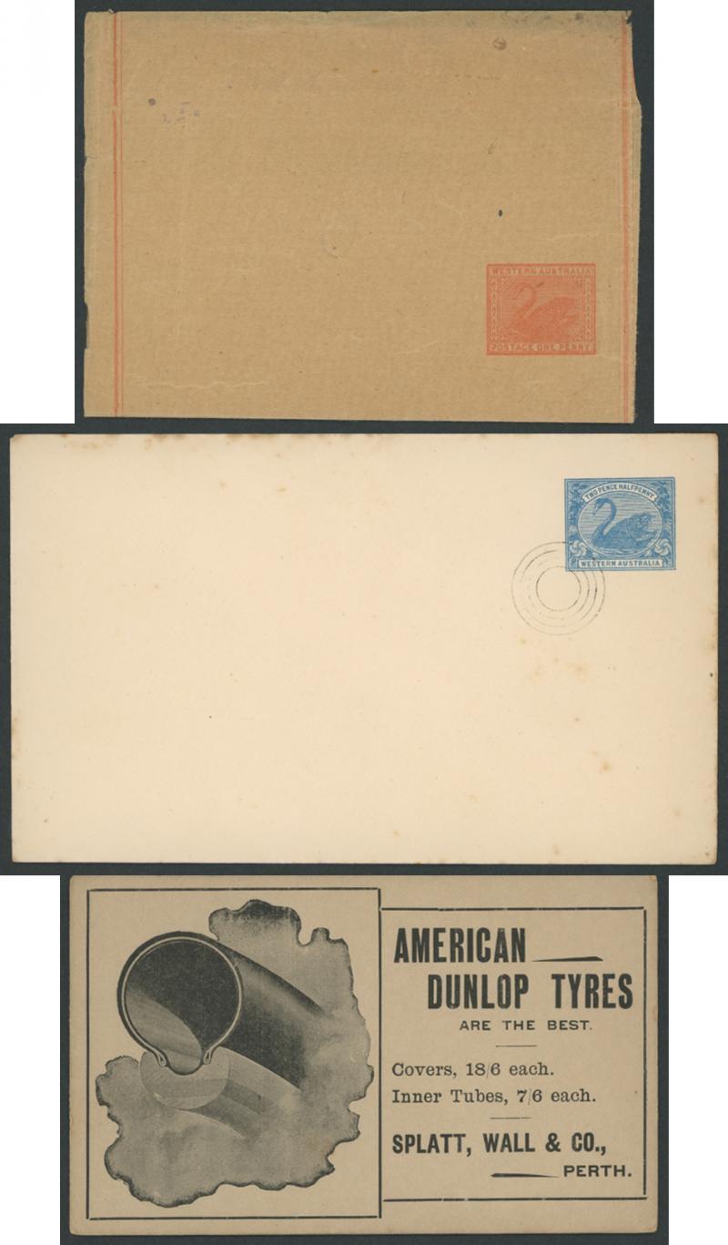 POSTAL STATIONERY: Useful selection unused unless stated otherwise including Wrapper with Double Borders 1d; Registration Envelope 3d sizes F CTO (minor spotting) and G (very fine); Envelopes 2½d blue CTO (faint spotting) & 'ONE PENNY' on 2d (minor spotting); Postal Cards 1d blue with American Dunlop Tyres advert, 1d with 'SPECIMEN' Handstamp (damp-spots), ½d sepia (faults) to Midland Junction with superb 'T'-in-circle & CofA 1d Postage Due, 1½d on 3d to GB (clipped corner), 1d 125x95mm postally used x2 (both soiled), 1d Surfaced Stock unused, 1d on 2d and 1d+1d Reply Card both very fine unused; Letter Cards 2d blue with Text on Reverse and 'ONE PENNY' on 2d x2 all very fine; etc, condition rather mixed.
