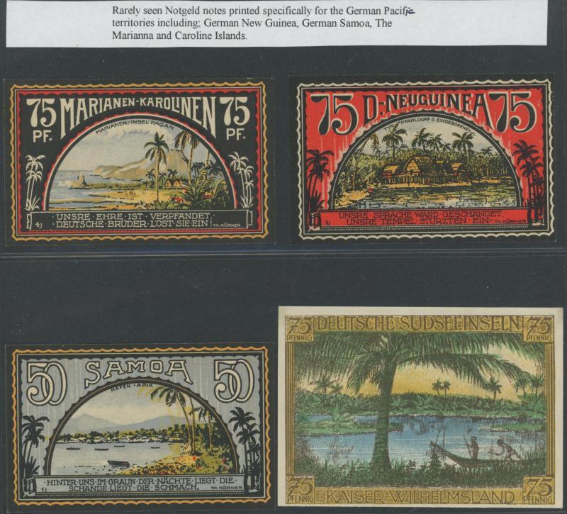 World banknotes in two ring-binders with Hyper-Inflation notes from 1920s Germany plus Notgeld (5) for Colonies with Mariana-Caroline Islands, New Guinea, and Samoa; 1990s Yugoslavia, Zimbabwe including Reserve Bank 2008 $20 Billion, $10 Trillion, and $100 Billion Agro-Cheque; 1940s Japanese Invasion money; plus mostly pedestrian modern notes including Iraq 1991 Gulf War Emergency Printings, and 'HELL' banknotes; condition variable.