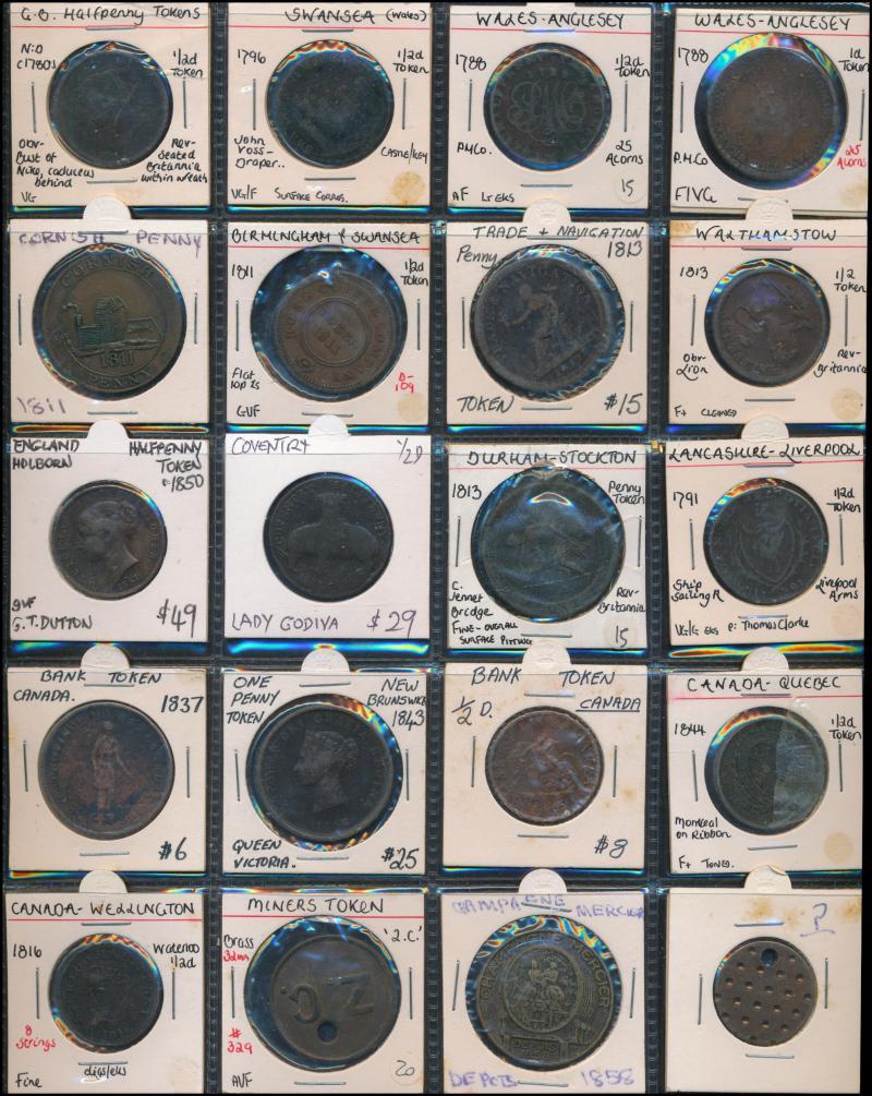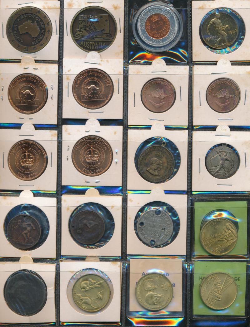 Tokens, medals, and medallets in two 2"x2" albums, including Australia Numismatic medallions, tokens including Amusement, Beer, Bread, Luna Park Restaurant, Manly Ferry, Parking, Photocopying, Telephone, 1974 $1 Wrest Point Casino, Royal Queensland Yacht Club (various); Great Britain RAF Rifle Association 38mm un-named; New Zealand 1d Dunedin Tramways; USA tokens 1863 Robinson & Ballou N.Y., Kansas Sales Tax, Missouri Sales Tax (various), 5c Officers Open Mess, Lancaster Cigar Store; etc, condition variable. Weighs 9kg.