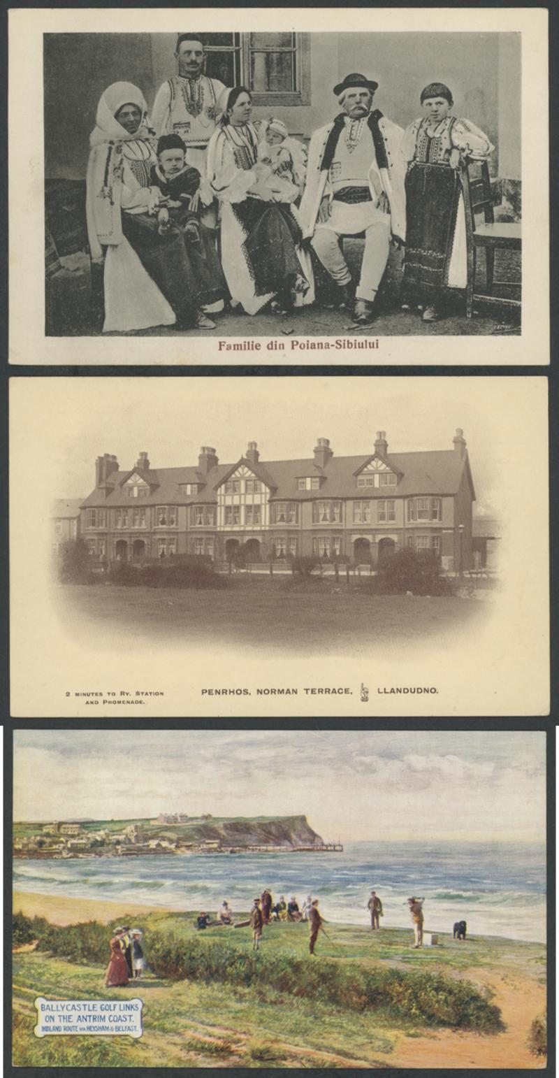 Completely unsorted array in a large box with strong British content including vilages, royalty, actresses & glamour, children, shipping, railways, advertising, etc; other countries including New Zealand, Canada, West Indies, Japan etc with many attractive cards throughout; condition variable but most are fine to very fine and a good number are superb unused. Also some postal history including GB pre-stamp Free Mail, and unused Postal Stationery with a few better items from Belgian Cono, Bulgaria & German Local Posts.