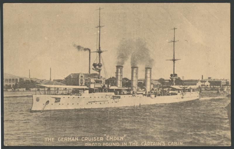 COCOS ISLANDS: circa 1915 Australian (?; no publisher) SMS 'Emden' & HMAS 'Sydney' incident featuring both ships before the "battle" & the 'Emden's' officers & crew x3 (one apparently taken in Malaya), the wreck of the 'Emden' x3, the launch used to get to the cable station, the Australian wireless operator who contacted the 'Sydney', the wrecked wireless station, & Australian Lighthorsemen with the 'Seized German Steamer/Kanstaft at Colombo', very fine unused. Not previously seen by us.