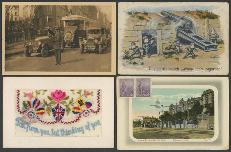 Unsorted array in a carton with good ranges from Australia, United Kingdom including Cornwall. Scotland, Wales & Ireland, and European topographicals, some Canada mostly of the Rocky Mountains, Latin America and New Zealand, a bundle of Venice bookmark-size PPCs, also subjects including Children, Animals, Humour and Romance plus an album of 'Hands Across the Sea' types, also several World War I patriotic 'silks', condition variable but generally fine to very fine.