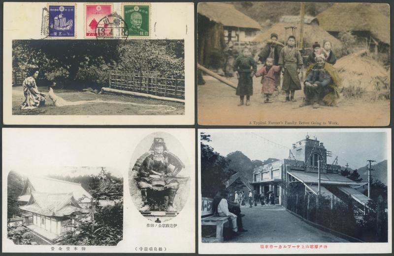 JAPAN: pre-World War II collection with numerous obligatory temples & Zen scenery but also many better subjects including Portraits, Geishas, Villages, Tokyo Earthquake, Culture including a group of Asahido Theatre issues, etc, 20 or so with commemorative (?) cachets in violet, etc, condition variable but generally fine to very fine. Attractive lot.