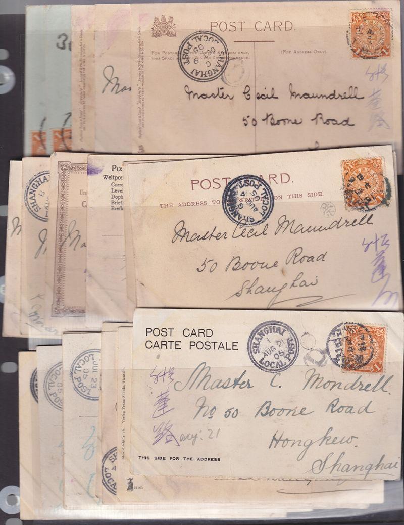 1905 5x Picture Postcards to Shanghai,China. 4 have PAQUEBOT markings, 3 with Shanghai Local Post cancels. 1 Postcard with a water stain, 2 with light soiling (5) (Image)