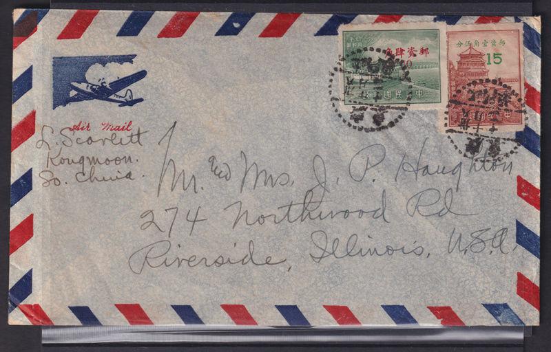 1949 (12OC) Airmail Cover with 15c & 40c Silver Yuan Currency Stamps SG 1358 & 1359 tied by Kongmoon cancel to USA. Fine & Very Scarce Silver Yuan Currency Cover (1) (Image)
