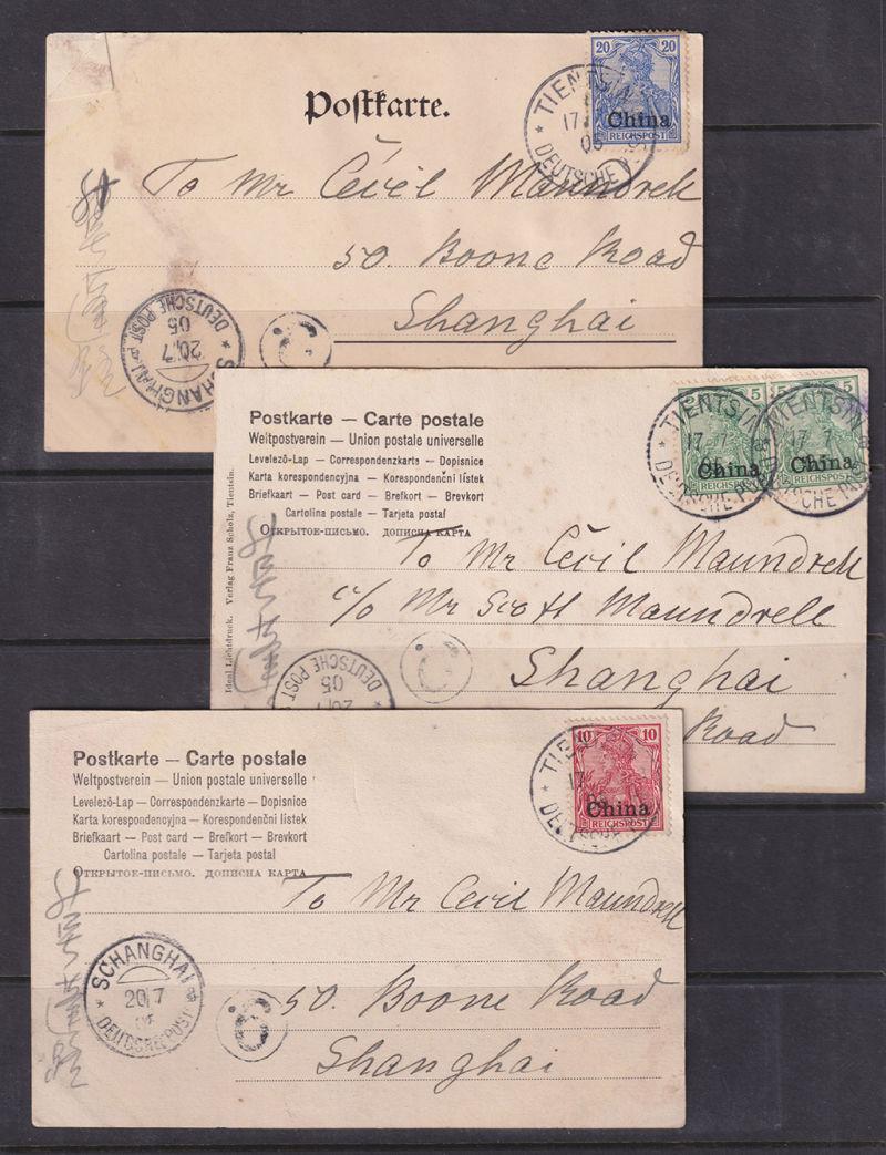 (German) 1905/06 3x Picture Postcards Posted with German China Overprints - 5c(2),10c & 20c values All Posted at TIENTSHIN/DEUTSCHE cancels to Shanghai, China. Slight soiling (3) (Image)