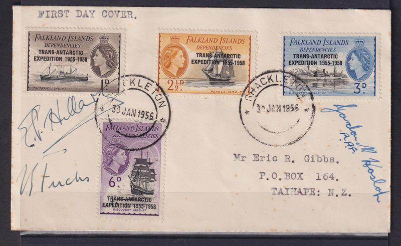 1956 (30JA) Trans Antarctic Expedition First Day Cover signed by EP Hillary, Fuchs & Gorddon Hoslop RAF. Very Scarce signed cover with the signature of Hillary & Fuchs. The cover has light ageing (1) (Image)