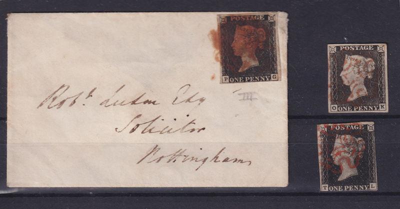 1840 QV 1d Grey Black SG 3 Fine Used with 4 Margins Letters OK,1d Black SG 2 with 2 Margins & Red Maltese Cross cancel Letters TL,Small Envelope addressed to Nottingham with 1d Black Plate 3 with 4 Margins tied by overinked Red Maltese Cross cancel Letters PG. SG Cat £1625 (3 items) (Image)