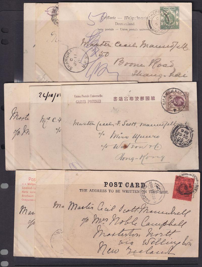 1905/06 Range of Picture Postcards - 4x Hong Kong to New Zealand, 2 from Shanghai to Hong Kong, 2 Shanghai to New Zealand, 1 from Chefoo to Shanghai. A few cards have water staining or soiling (9) (Image)