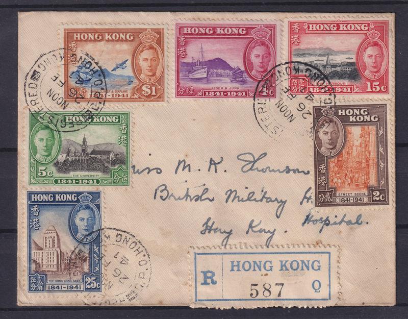1941 (26FE) Centenary of British Occupation Set SG 163/68 tied on Registered Plain First Day Cover. Minor staining. Cat HK $2000 (1) (Image)