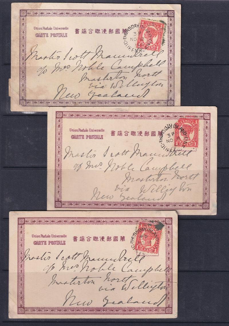 1905 (NO18) 3x UPU Thursday Island Picture Postcards (all different) all with QV 1d Red’s tied by unframed Thursday Island/Queensland cancels. 1x Postcard has a water stain. 1 Postcard with 1x stamp damaged. (3) (Image)