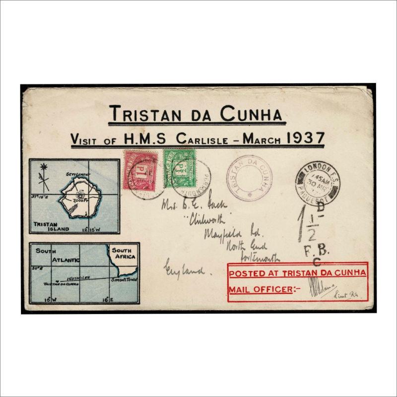 1937 (MR) Printed ‘Visit of HMS Carlisle’ Large Cover with ‘Tristan Da Cunha’ Type 7 cachet. Has Red Boxed Posted at Tristan Da Cunha Mail Officer signed at bottom right. Has a Postage Due - 1 1/2d F.B.C. cachet with GB 1d & 1/2d Dues tied. Also London F.S. Paquebot cancel. The cover has light ageing (1) (Image)